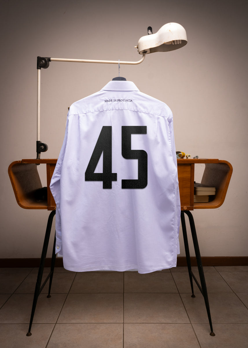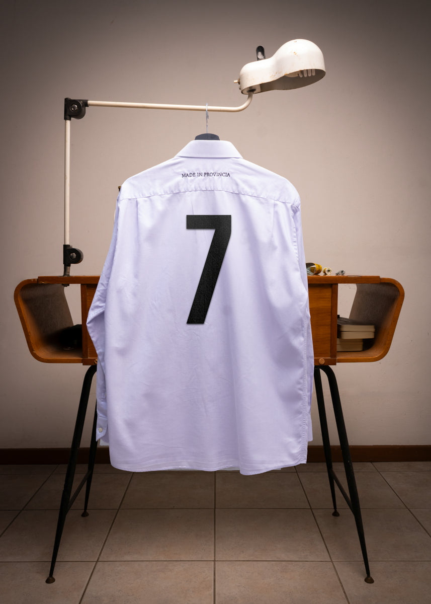 Ogni numero è cucito con cura a mano, realizzato in cotone recuperato. Un dettaglio che rende ogni camicia unica, pensata per rappresentare chi la indossa.