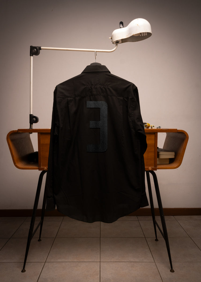 Ogni numero è cucito con cura a mano, realizzato in cotone recuperato. Un dettaglio che rende ogni camicia unica, pensata per rappresentare chi la indossa.